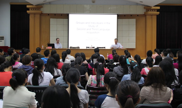 报告会上, Terence Odlin博士首先以中国和芬兰为例分析了多语环境下的各种语言接触现象,然后分析了以芬兰语为母语、英语为二语的英语学习者及以芬兰语为母语、瑞典语为二语、英语为三语的英语学习者在介词及冠词习得上的异同,具体阐释了一语对二语及二语对三语的影响。同时,Odlin博士还探讨了语言迁移中的群体共性及个体变异,从方法论上阐明了研究语言迁移对个体差异影响的必要性。讲座最后,Terence Odlin博士深入细致地解答了师生们提出的问题。