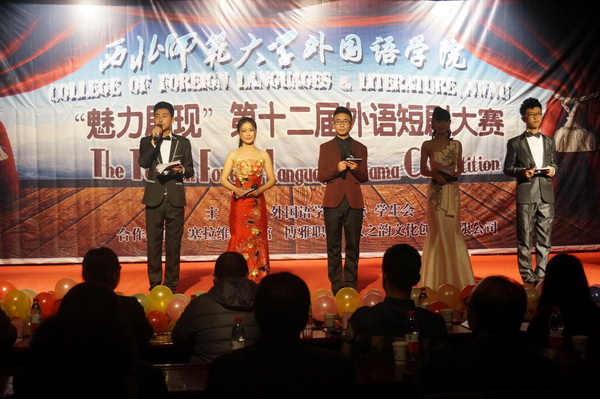 2014年11月25日晚,yl6809永利“魅力剧现”第十二届外语短剧大赛决赛暨展演在大家的期待中于大学生活动中心二楼多功能厅举办。学院党委书记吴梦龙、党委副书记李杰、副院长高育松、副院长王建人应邀出席了本次活动。西北师范大学学生会专职秘书长杨庆,yl6809永利宁振业老师、翻译系杨晓红老师、俄语系王海燕老师、日语系程朝侠老师、阿拉伯语系马志远老师及外教Carley担任了此次大赛的评委。各系系主任、各班班主任、各年级本科生共计400余人观看了比赛。