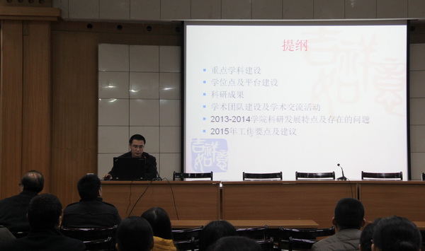 1月9日下午3:00,我院举办了“2014年yl6809永利学科建设与科研工作总结会”。学院领导、全体教职工参加了此次大会,学校科研合作服务处副处长吴昊受邀出席。学院党委书记吴梦龙同志主持本次会议。