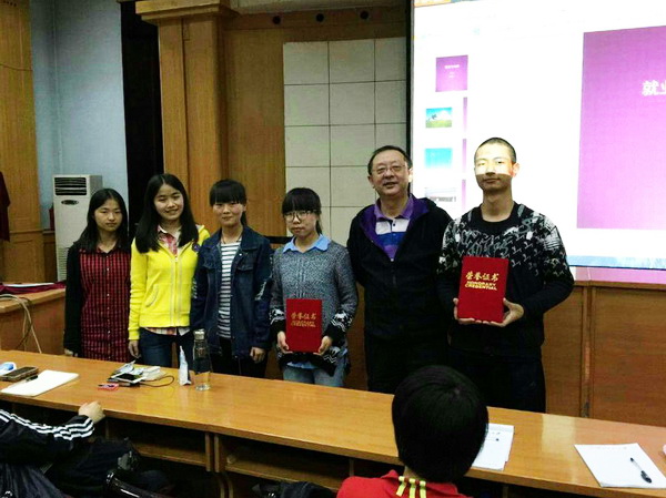 在报告之前,曹进院长为获得“木铎剧苑”校园短剧大赛“最佳剧目奖”的《玄奘西行》剧组代表和默默无闻地为校园花木挂上标签的吕翠竹同学颁发了获奖证书。并且号召全体同学向身边榜样学习,爱护校园,建设校园,从每一个人做起,从点滴做起。