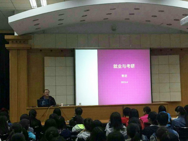 随后,曹进院长为200多名本科生是考研还是就业做了精彩的指导。他以一系列图片和最近网络流行的教师辞职书“世界那么大,我想去看看”为例,告诉大家要目光长远,多看看外面的精彩世界。紧接着曹进院长针对跨专业考研与本专业考研进行了详细的讲解,就考研的内容与方向作了重点说明。这为大学生考研与读研指明了努力的方向。最后,曹进院长预祝同学们能够在考研与读研的道路上一帆风顺。