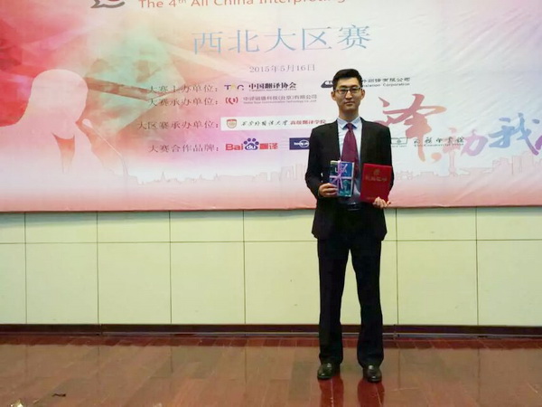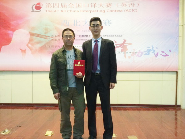 “第四届全国口译大赛”西北大区赛于2015年5月16日上午在西安外国语大学(长安校区)举行,我院MTI2014级口译方向李海诚同学代表我校参加。比赛分上下半场,分别为英译汉和汉译英。李海诚同学经过努力,获得大赛二等奖。李海诚同学顶住压力,表现优秀,体现了师大外院同学的风采。同时,宁振业老师获得优秀指导教师奖。