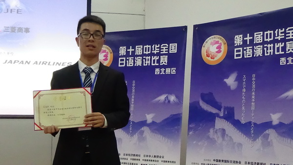 5月30日,“第十届中华全国日语演讲比赛”西北赛区预赛在兰州大学隆重举行。我院日语系3年级文佰平同学代表我校前去参赛,并凭借其优异的表现,在“主题演讲”和“即兴演讲”两个比赛环节的激烈角逐后荣获三等奖。王辉老师获得优秀指导教师奖。