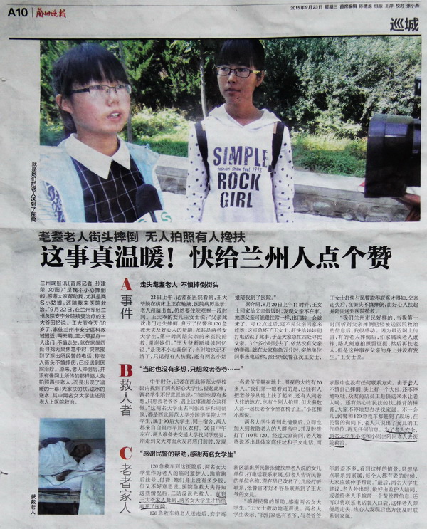 张正妍、周朝岚同学来自我院2013级英语6班,据她们讲:“我们第一眼看到的是,已经有人把老爷爷从地上扶了起来,还有人问老人住的地方,也有个别人拍照,但大多数人都一起扶老爷爷坐在椅子上。”随后她们也立即加入到救助老人的人群当中,并及时拨打了110和120。为了老人安全,两名同学陪老人一同前往医院救治,并作为老人的临时监护人,跑前跑后挂号、付费。两位同学表示:“我们家也有爷爷,与老爷爷年龄差不多,看到这样的情景,只想早点联系到家属,每个人都有老的时候,大家应该伸手帮助。”2015年9月23日的《兰州晚报》 A10版对此进行了整版报道。