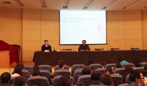 报告会上高育松教授从二语习得的主要问题、主要理论、理论范式转换及方法基础四方面入手,提出了二语习得理论关注的重要现象。接着,高教授以批判理性主义为基点提出让人困惑的二语习得谜题,并和大家分享了自己对习得谜题背后的宏观语言问题的见解。然后,高教授又分别从认知科学、社会转向和双语转向三个方面对语言学习观进行了全面的阐释。最后,高教授提研究二语习得的方法选择并强调二语习得中认知主义的重要性。
