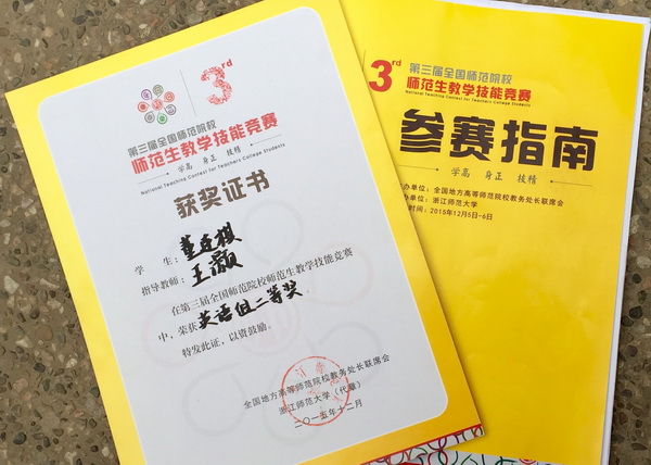 12月5日至6日,第三届全国师范生教学技能竞赛在浙江师范大学举行。我院2013级英语1班董连棋、指导教师王灏最终获得英语组二等奖的好成绩。