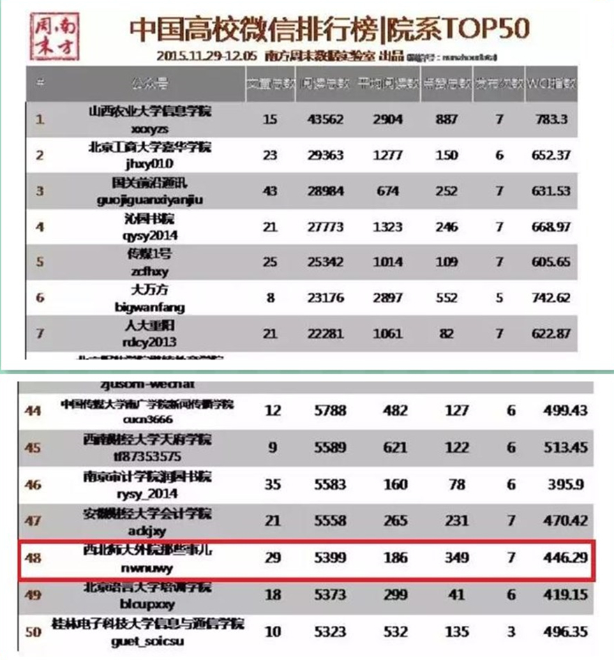 12月8日,南方周末数据实验室公布的第59期《中国高校微信排行榜》(11.29—12.5)榜单发布。学院团委微信公众号“西北师大外院那些事儿”以5399次的阅读量,在近2000个高校微信公众号中脱颖而出,位列院系排行榜第48位。