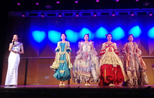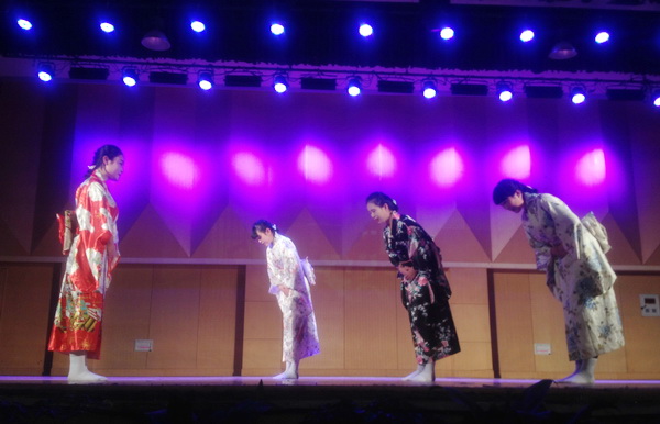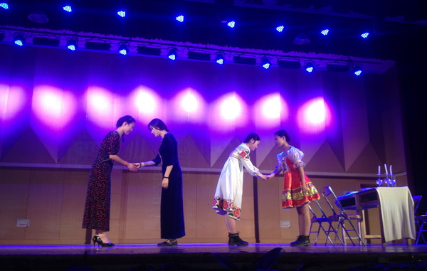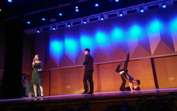 表彰大会结束后,古典优雅的扇子舞《茉莉花》拉开了迎新晚会的序幕,“香从清梦回时觉,花向美人头上开”,优雅的舞姿、舞动的红扇,让在场观众不觉耳目清新;晚会节目形式多样,有湖南话的双簧表演《糊涂县官》,有动感十足的韩国舞《Heart attack》,有研究生带来的的青春洋溢、活力十足的街舞,还有乐队带来的《喜欢你》《童年》《一万次悲伤》,点燃了现场的气氛,又带大家重温了经典;小品《感染者》笑点不断,“僵尸舞”也让观众尖叫不绝;学院礼仪队带来的《礼仪博览会》,展示了中国汉代、俄罗斯、英国、阿拉伯国家及日本的礼仪文化,具有各国特色的精美服饰和极具异域风情的音乐,带给了观众一场视听盛宴,并让观众在欣赏节目的同时了解到了礼仪文化知识;《外文歌曲联唱》,各系师生齐上阵,用各国语言翻唱中文经典曲目,带给观众别有外院风味的歌舞盛宴;学院团委学生会带来的《Shake in 院儿》,热舞加改编了歌词的歌舞表演,引得场上尖叫阵阵、笑声不断;《少数民族大联欢》歌舞串烧,更让观众在短短的时间内体验到了彝族、维吾尔族、藏族和裕固族的风情,欢歌笑语、掌声连绵。