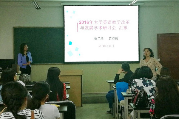 6月2日下午,由大学英语教学部与外语教育学术团队共同组织的学术报告在学院603教室举行。蔡兰珍教授和黄彩霞副教授作了题为“2016大学英语改革与发展研讨会的汇报与反思”的报告,两位报告人主要围绕《大学英语教学指南》(征求意见稿)背景下的大学英语教学标准、课程设置以及五月份在华东师范大学举办的“标准、课程与教学”为主题的大学英语教学改革与发展学术研讨会,与大学英语教学部教师、外语教育学术团队成员共同探讨大学英语改革的发展趋势与改革方向。大家在讨论中一致认为,大学英语教师应结合自身教学实际,紧密关注大学英语教学改革动态,并从教学目标、课程体系、教学模式、评估手段、教学资源、教学内容、教师发展专业化等角度对我校目前的大学英语教学进行反思,才能有效地应对时代要求,并促进个人专业化发展。