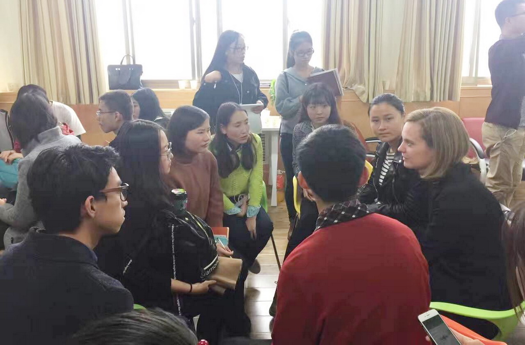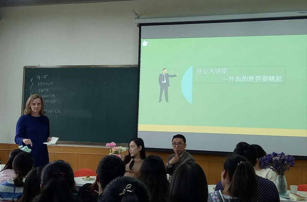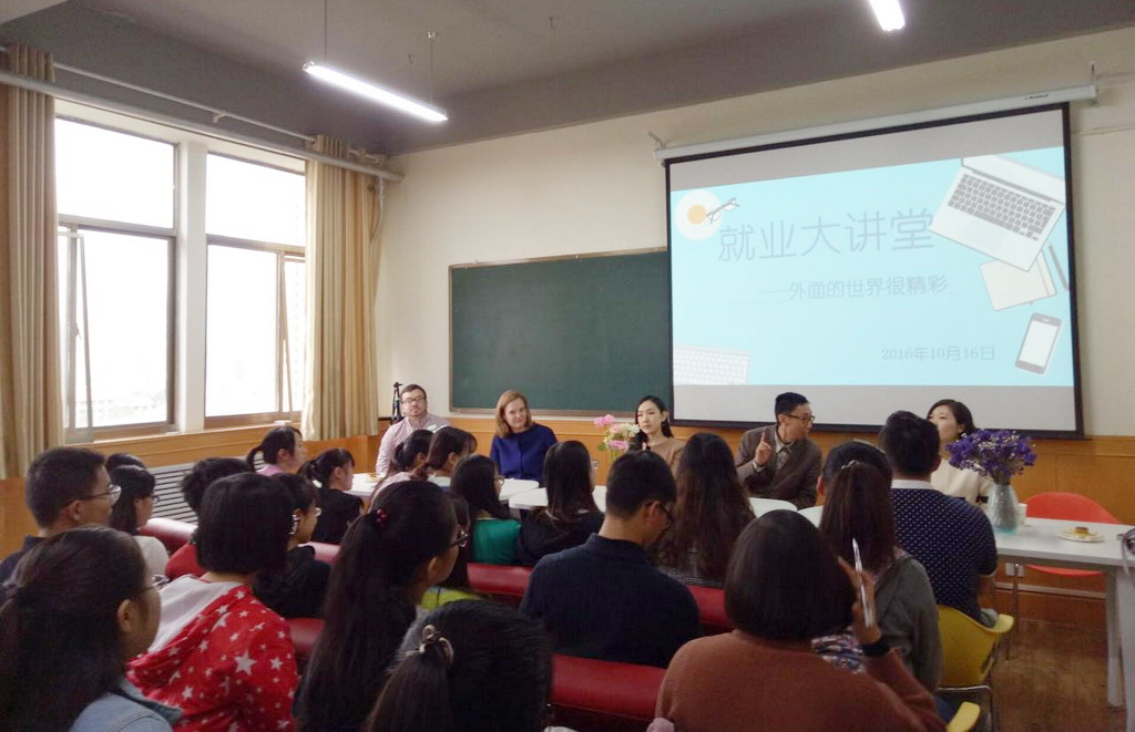 10月16日早,在教学三号楼911“三指导工作室”举行了“就业大讲堂”(外院专场)活动。《慈善家》杂志社长王立伟、中央电视台双语主持关馨、中国英国商会主席Clare、英国北方大学联合会中国区负责人Alan四位嘉宾以及外院团委陈潇老师、孙佳禾老师和我校50余名同学参加了此次活动。
