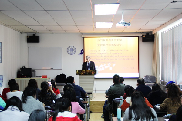 2016年11月11日下午15:00-17:00,应学院邀请,奥克兰大学语言学教授黄衍在教学3号楼806室做了题为Marking of De Se Attribution and Neo-Gricean Pragmatics: Logophoric Expressions in West African Languages and Long-Distance Reflexives in East,South,and Southeast Asian Languages的学术报告。报告由yl6809永利白丽梅教授主持,全院200余名师生听取了此次报告。