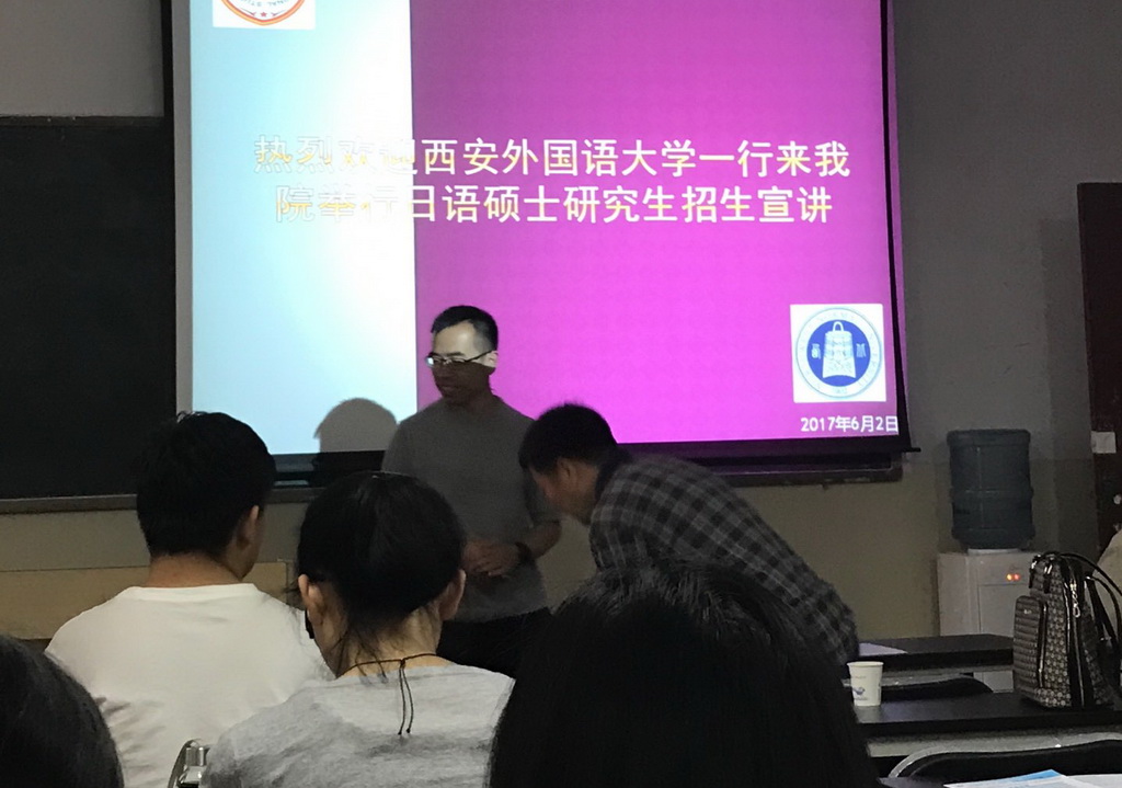 6月2日(周五)上午,西安外国语大学日本文化经济学院南海老师一行来我院举行2018年研究生招生宣讲会。日语专业2014级、2015级50余名学生及部分教师到场听讲。