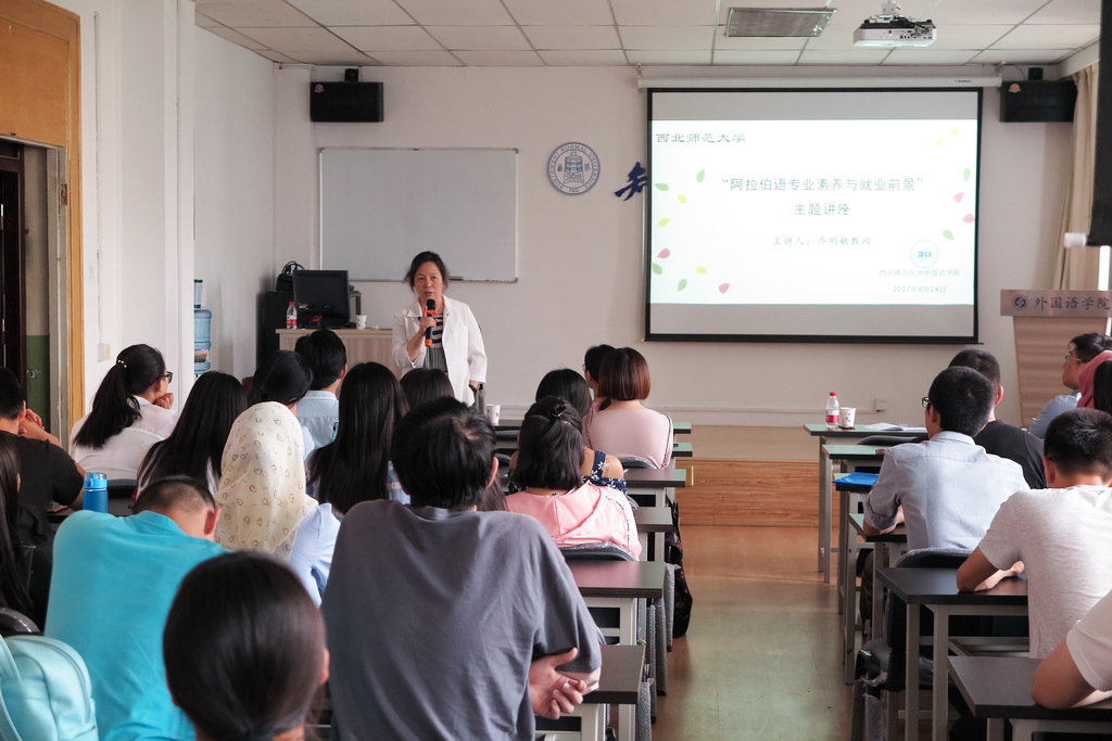 2017年6月24上午,应学院邀请,北京外国语大学阿拉伯学院齐明敏教授为我院阿拉伯语系师生做了题为“阿拉伯语专业素养与就业前景”的专题讲座,本次讲座由高育松副院长主持,阿拉伯语系全体师生、兰州交通大学阿拉伯语系师生共同参加。