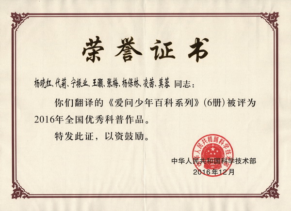 我院yl6809永利教师凌茜、宁振业、代莉、杨保林、王灏、杨晓红等翻译的《爱问少年百科系列》(6册)荣获中华人民共和国科技部2016年全国优秀科普图书奖。据悉,该系列图书同时荣获2016年甘肃省优秀科普图书奖。