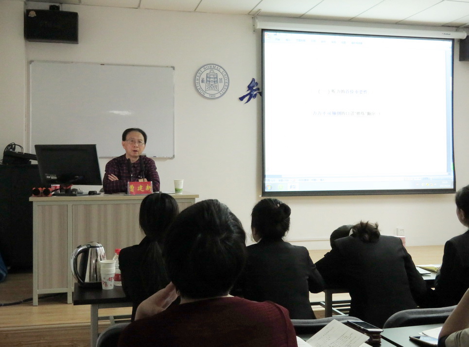 曹教授用事先准备的翻译实战材料,对在座师生进行了两个小时的源语言单向记忆能力的训练和交传口译训练。曹教授口头朗读一到两个句子,要求大家用耳朵听,不能做速记,然后迅速反应输出源语言,并做出翻译。实践出真知,曹教授的实战指导,使我们认识到听力的头等重要性,听得懂是一切口译输出的基本。曹教授教法新颖,教学过程扎实有效,主要训练大家的短时记忆能力,深入浅出的阐释听说读写不是一通百通,而需要打破界限,通过有效大量的训练才能有所成就。