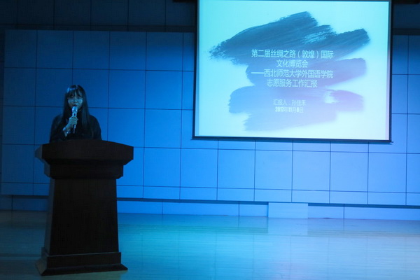 会上,参加了“红豆草”暑期实践、暑期寻访校友实践活动、第七届敦煌行·丝绸之路国际旅游节、斯达克听力基金会“世界从此欢声笑语”中国(甘肃)项目的四位同学与第二届丝绸之路(敦煌)国际文化博览会志愿服务工作的带队教师分别进行了汇报总结,分享了他们的实践及志愿服务的经历与感想。