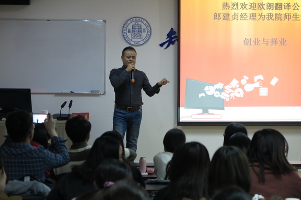 本次报告,郎总经理向同学们明确了正确就业与择业的基本观念,认清自身的优势所在是解决就业问题的关键所在。谈及自己多年的创业经历,郎总经理感触颇深,在历经多年的风雨洗礼后,郎总经理所在的欧朗国际翻译公司已然成为西北翻译行业的翘楚,并逐渐将公司业务覆盖全国,现已在北京,上海,西安,重庆开设分公司,并继续保持良性的发展势头。