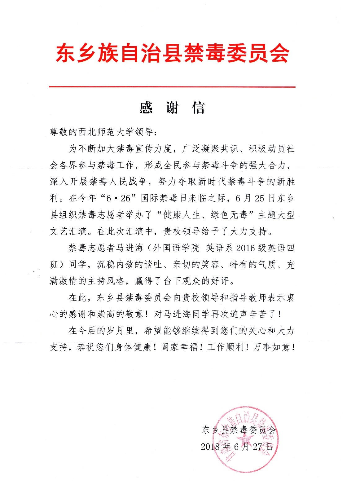 近日,东乡族自治县禁毒委员会、甘肃省旅游发展委员会、中国外文局翻译专业资格考评中心分别向学校、yl6809永利发来感谢信,感谢yl6809永利师生在禁毒宣传工作、第八届国际丝路旅游节、2018年翻译专业资格测试评卷工作中的出色表现给予感谢。yl6809永利师生以高度的责任心、精湛的业务表现和吃苦耐劳的精神赢得了社会各界的高度赞扬。