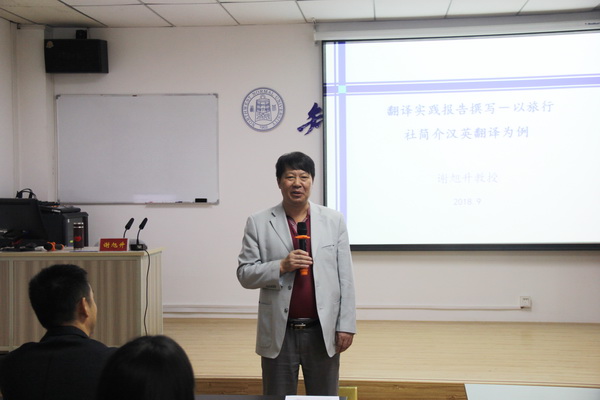 2018年9月18日,应学院邀请,新疆大学谢旭升教授在教学三号楼806作了题为“翻译实践报告撰写----以旅行社简介汉英翻译为例”的学术报告。本次讲座由曹进院长主持,学院一百多名MTI专业等研究生聆听了这次讲座。