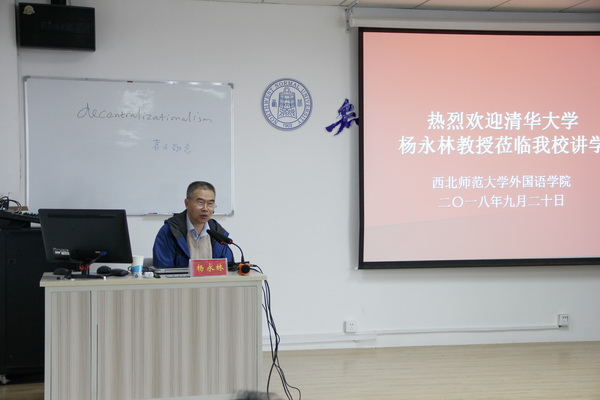 2018年9月20日,应学院邀请,清华大学外文系外国语言研究中心主任、博士生导师杨永林教授在教学三号楼806做了学术讲座,讲座的题目为“立足学科前沿,发扬工匠精神”。曹进院长及学院部分老师及一年级全体研究生参加了这次讲座。