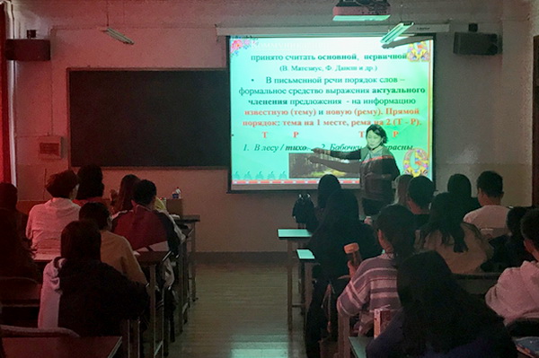 10月11日下午,学院俄语系邀请俄罗斯卡尔梅克共和国民族创作中心的卡尔门.安扎耶夫娜.朱什希诺娃在教学3号楼605教室作了题为“全球文化视角下的民族文化传播—词序与交际功能”的学术讲座,俄语系师生参加了此次讲座。
