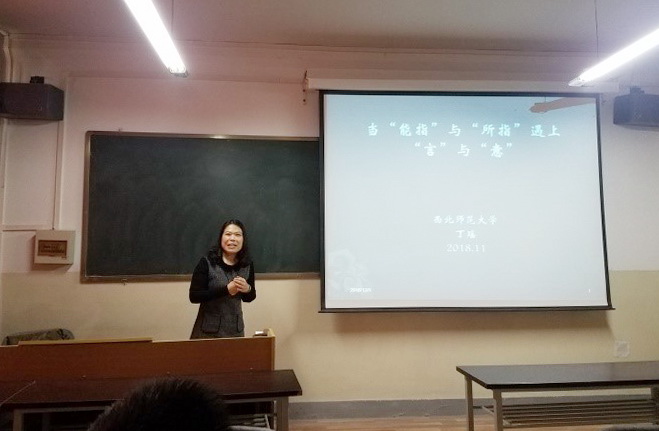 蒋老师向同学们介绍了丁老师本次学术报告的题目,希望引起同学们的兴趣,拓宽同学们的研究视野。此次学术报告由四个部分组成,分别为“能指”与“所指”及任意性关系、先秦时期的名实观、中国传统诗学中的“言意之辩”以及当“能指”与“所指”遇上“言”与“意”。丁老师就针对自己的研究方向语言与跨文化传播提出了两个研究视角,即“跨语言中的文化问题”与“跨文化中的语言问题”以此为切入点展开报告。