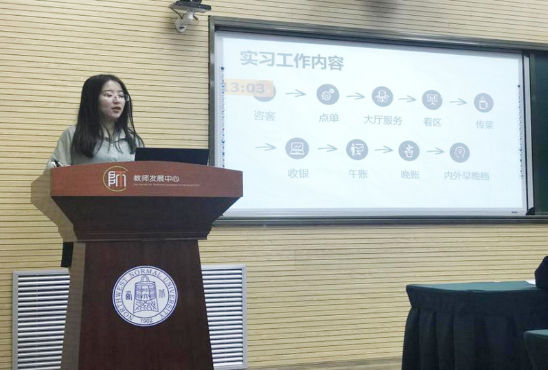 首先,俞婷副院长致辞、并就此次活动的目的与评审细则作了详细说明。然后,日语系2015级的八位申请推优的同学与大家逐一分享了各自在实习地的工作内容、实习收获、实习感悟与教训。各位评委逐一就参评学生的实习手册填写、现场报告情况进行了现场打分。最后,俞婷老师总结发言,认为同学们经过专业实习的锤炼,不仅积累了专业知识,其专业技能、个人素养、应变能力均在实践中得到了不同程度的提升,每位同学都在实习中获得了喜悦与成长。