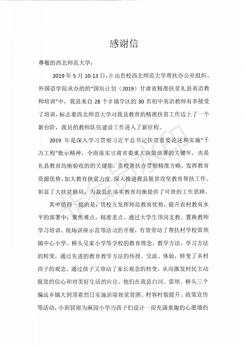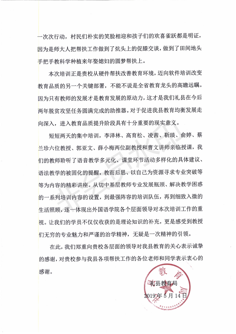 2019年5月10日-13日,我院成功举办了“国培计划(2019)”甘肃省精准扶贫礼县英语教师培训班。在学员中产生较大反响,近日,礼县教育局向我校发来感谢信,表达了对我校、我院关注基础教育,助力礼县提升教育品质的感谢。