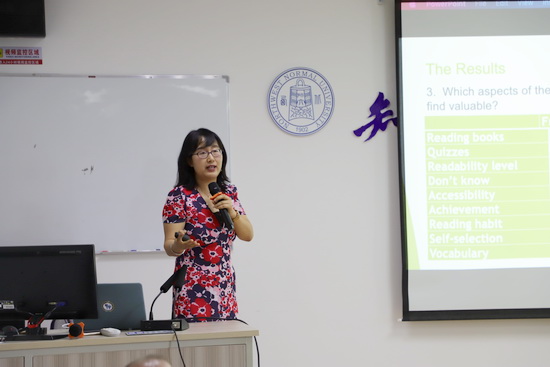 报告会上,Paul副教授分别从概念定义、基本原则、突出优势、材料甄选和实际效果这五个方面探讨了范读(extensive reading, ER in short)对学习者语言学习和阅读能力的帮助。首先,Paul副教授通过形象生动的动画引入语言学习这一话题,并以层层递进的方式将视角聚焦于阅读对语言学习的影响与作用这一方面。接着,通过类比排球运动、引用具体实例、结合数据分析向在座的老师们与同学们深入浅出地介绍了XreadingV.L.这一软件的教学优势与使用方法。此外,周静博士从研究问题、研究方法、研究设计、数据采集与分析、研究结论和研究反思这几个方面分享了“Online Extensive Reading in EAP Courses”这一研究,从研究者视角讨论了ER对于学习这语言学习的促进作用。
