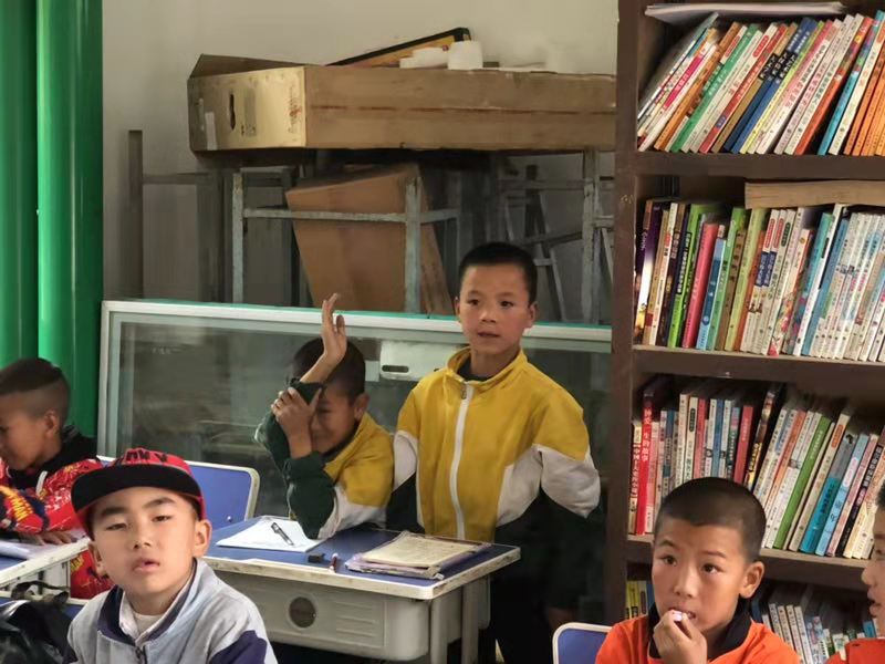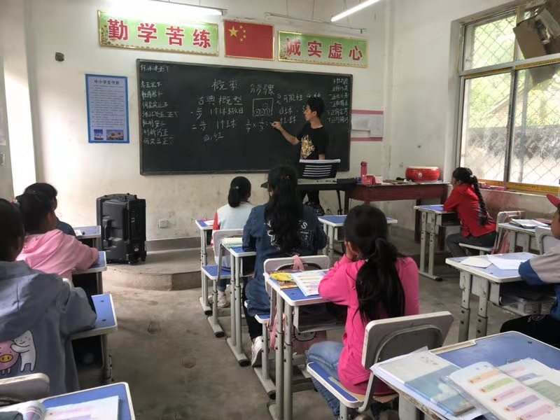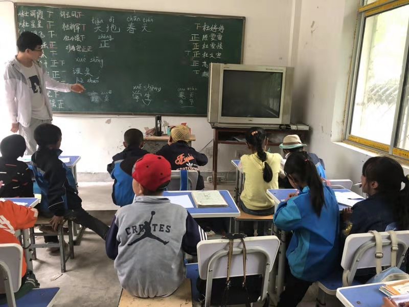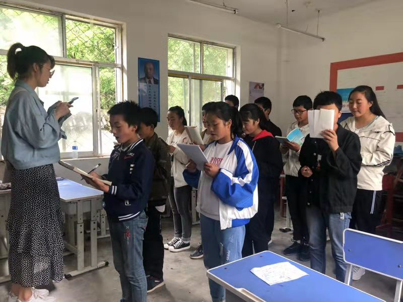 7月10日,在实践队员的带领下,低年级学生复习了学过的古诗词并排练了欢快轻松的舞蹈,随后,初中学生同他们一起学唱歌曲。