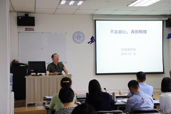 曹进院长作了《不忘初心,再创辉煌》的主旨报告。从学院定位、学科背景,发展目标任务、效能考核等方面介绍了学院落实《行动方案》的计划安排。要求学院全体教师全员上阵、深入学习、扎实推进、全员贡献、高效落实。鼓励全体教职员工转变转变观念,树立自信,鼓足干劲,谱写新时代学校教育事业改革发展的新篇章。