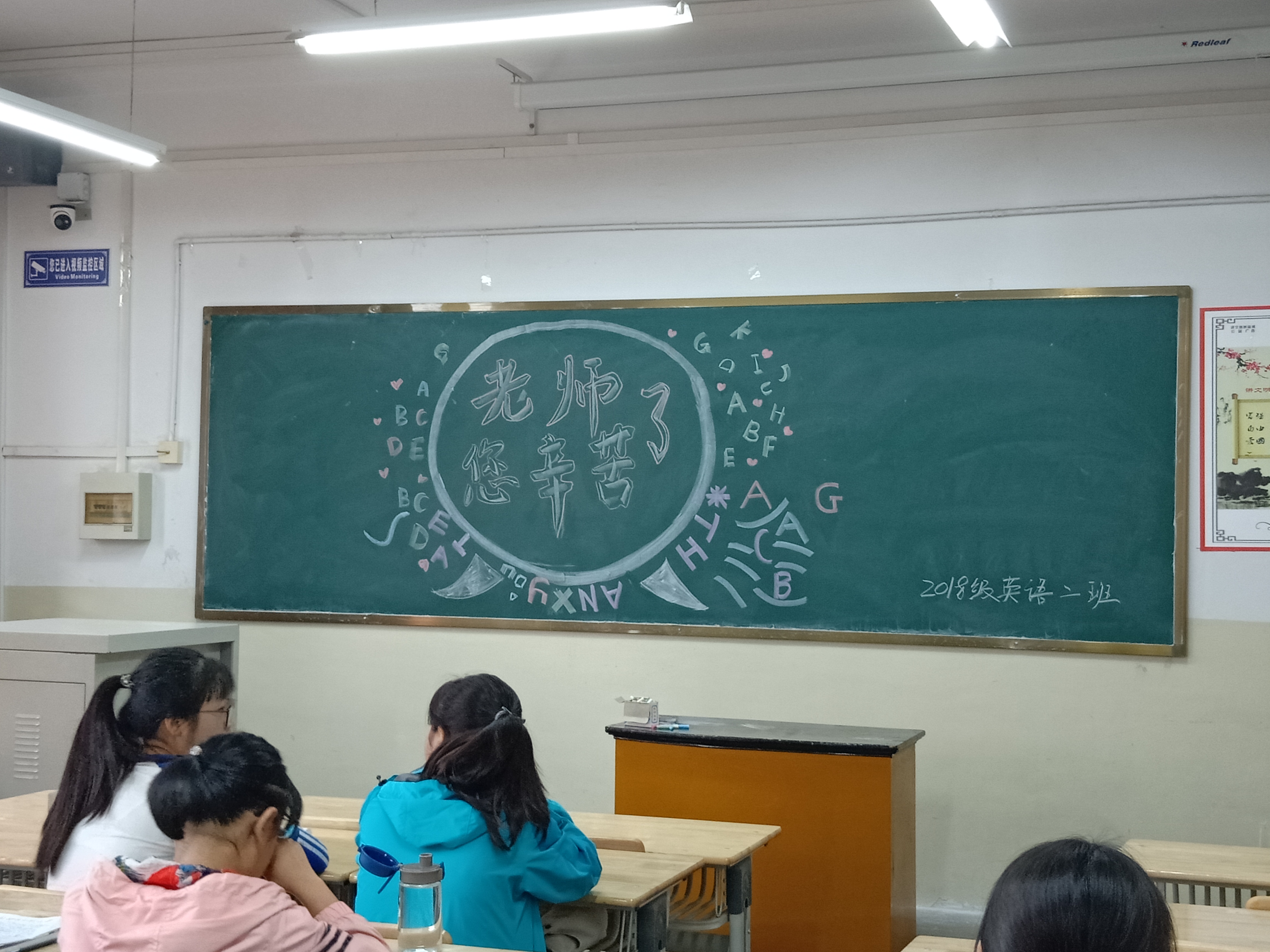 每堂课前,学生用心在黑板描绘教师节祝福“老师您辛苦了!”,“祝您教师节快乐!”等字样,精美的花纹、整齐的字迹无不体现尊师重教的浓厚氛围。当老师走进教室后,同学们全体起立,齐喊“老师,节日快乐!”或“教师节快乐!”,简短的一句话,却包含了同学们对老师最真挚的祝福。