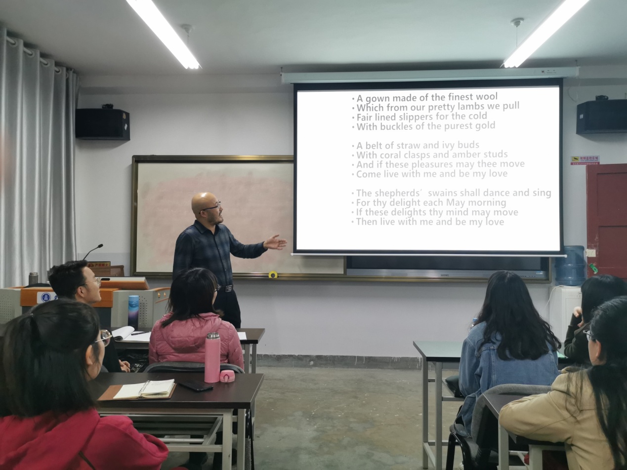 随后,张宝林老师引导同学们一同欣赏William Butler Yeats的When You Are Old。张老师解释道:读诗最重要的就是共情,当我们身临其境,文学作品中的“当你老了”便是现实的“当我老了”。换一个人称,也就换了一种角度,这是一首与以往不大相的When You Are Old。在赏析The Passionate Shepherd to His Love时,张老师提醒同学们:读诗,不应没有联想和共鸣,看到bright summer flowers,就应该想到一朵娇艳欲滴的花,看到autumn leaves,就应该想到摇摇欲坠的落叶。如果能够这样,那么读诗无异于是在欣赏一幅美画、在倾听一首高雅的音乐,读诗的目的也就达到了。