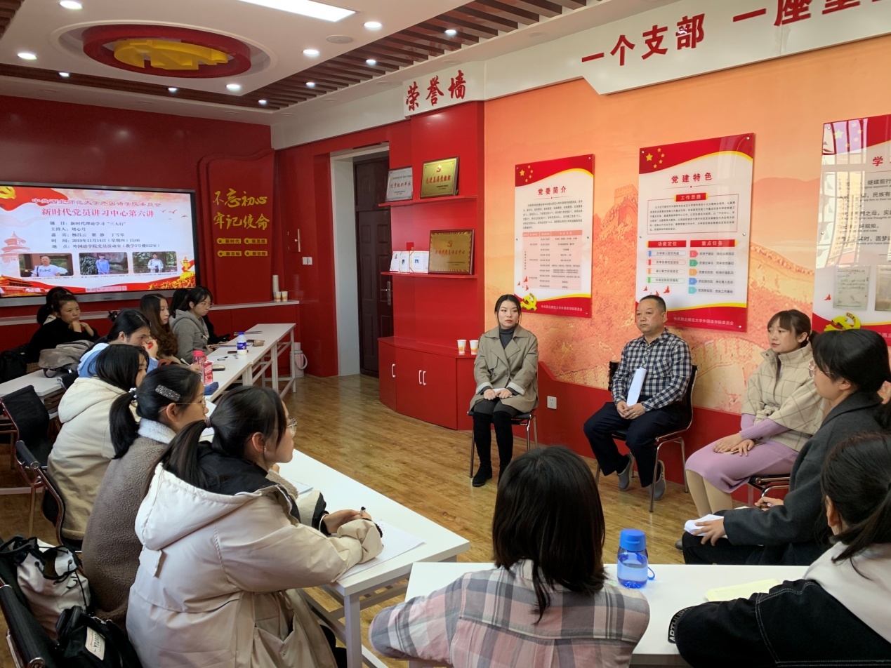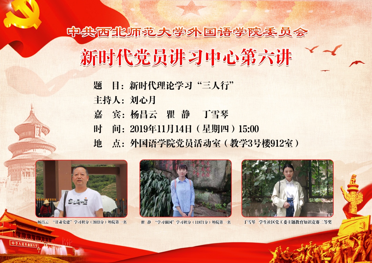 习近平总书记在“不忘初心、牢记使命”主题教育工作会议上强调:“开展主题教育,是用新时代中国特色社会主义思想武装全党的迫切需要。在新时代,我们党顺应时代发展新要求,创立了新时代中国特色社会主义思想。理论创新每进一步,理论武装就要跟进一步。”11月14日下午,yl6809永利新时代党员讲习中心第六讲以《新时代理论学习“三人行”》为题,邀请3位学院理论学习先进典型,他们分别是“甘肃党建”学习积分第一名(3933分)杨昌云老师、“学习强国”学习积分第一名(11871分)、研究生第三党支部党员、2017级英语笔译专业研究生瞿静、“学生社区党工委主题教育应知应会知识竞赛”二等奖获得者、本科生第三党支部党员、2016级翻译1班本科生丁雪琴,共同为师生党员带来一堂生动的理论学习经验分享会,一起聆听榜样的声音,寻找入党初心。会议由辅导员刘心月主持。