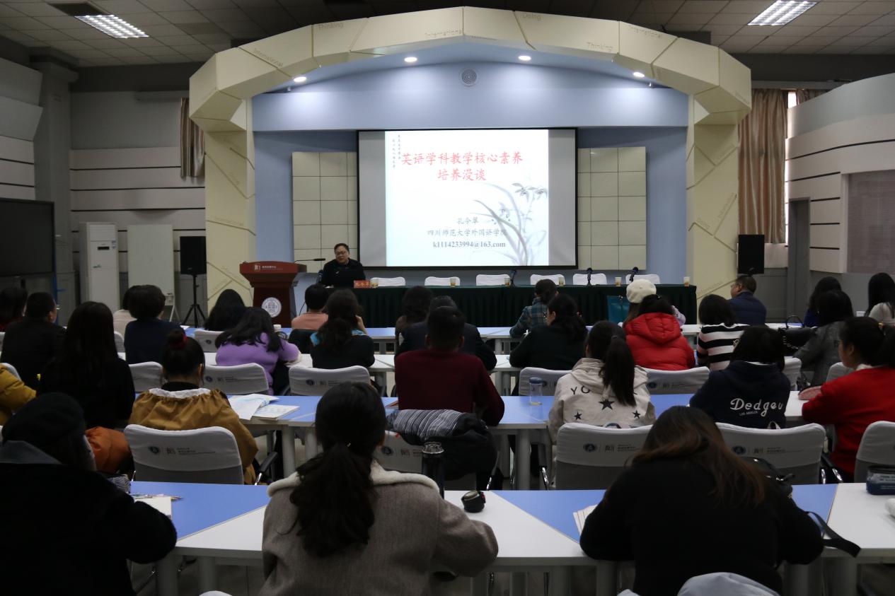 启动仪式结束后,四川师范大学yl6809永利院长、研究生导师孔令翠教授做了题为“英语学科核心素养培养漫谈”的学术报告。孔令翠教授解读了英语学科核心素养的内涵,并结合现实生活与英语教学实际,用朴素的语言和鲜活的实例,分析了外语学习在思维发展、心智启迪、跨文化能力培养等方面发挥的重要作用,展示了如何在英语教学中培养学生的语言能力、思维品格、文化意识和学习能力等核心素养。报告对我校外语教师教育改革、师范生核心素养发展有很好的启示和指导意义。