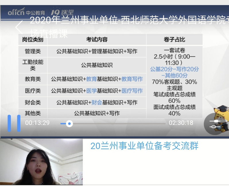 课程于3月16日-3月20日分五期开展,每日19时师生准时在“19课堂”平台见面。课程内容涵盖省内事业单位考情解析、公基(法律和非法专项)、写作(综合写作和教育写作)。课上,教师除讲授兰州事业单位各类岗位考试题型、分值分布和各项内容的基础知识框架外,也通过大量的真题例证考点、考频,师生线上互动积极。