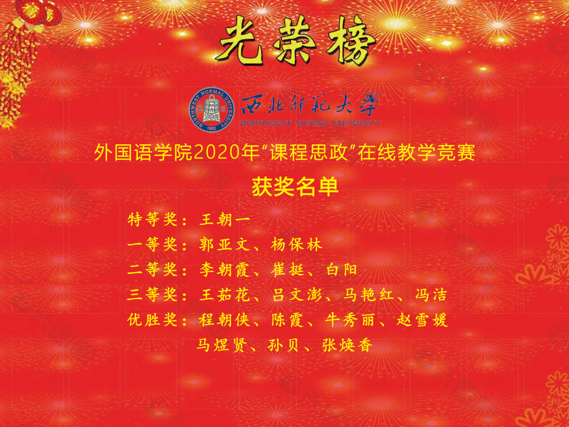 2020年4月12日,在初赛、复赛中脱颖而出的10名专业教师参加了决赛。15名来自校内外的外语教学、思政教育以及信息技术应用领域的专家和12名来自英语、翻译、俄语、日语、阿拉伯语、法学专业的学生担任本次竞赛的评委。经过激烈的角逐,最终,王朝一获得特等奖,郭亚文、杨保林获得一等奖,李朝霞、崔挺、白阳获得二等奖,王茹花、吕文澎、马艳红、冯洁获得三等奖,程朝侠、陈霞、牛秀丽、赵雪媛、孙贝、马煜贤、张焕香获得优胜奖。