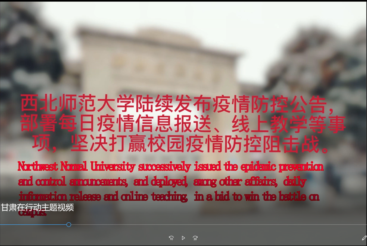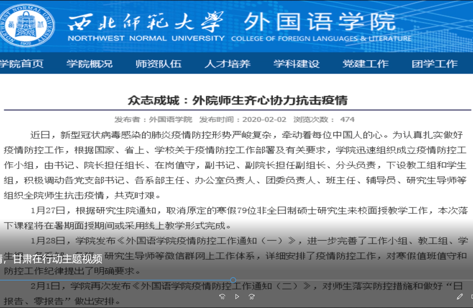 主题三:制作“抗击疫情,甘肃在行动”纪实视频。分“甘肃在行动”“西北师大在行动”“外院在行动”三部分呈现“防控就是责任、疫情就是命令”的战役大事记,体现疫情防控下的中华儿女坚定信念,众志成城抗击疫情的决心!在制作视频的过程中,2019级英语四班孔令欣同学说:“我希望能够将这些素材以一种不一样的形式呈现出来,让更多人知道疫情防控下的甘肃、西北师大、外院都在做什么,激发青年大学生对家国情怀、社会责任感的深层认知。”2018级英语二班郑子豪同学也说道:“看完视频,我觉得很震撼,在这场疫情防控阻击战中,没有一个人可以置身事外,每个人尽自己的力量为疫情防控所做的点滴努力,就是一种责任和担当。”