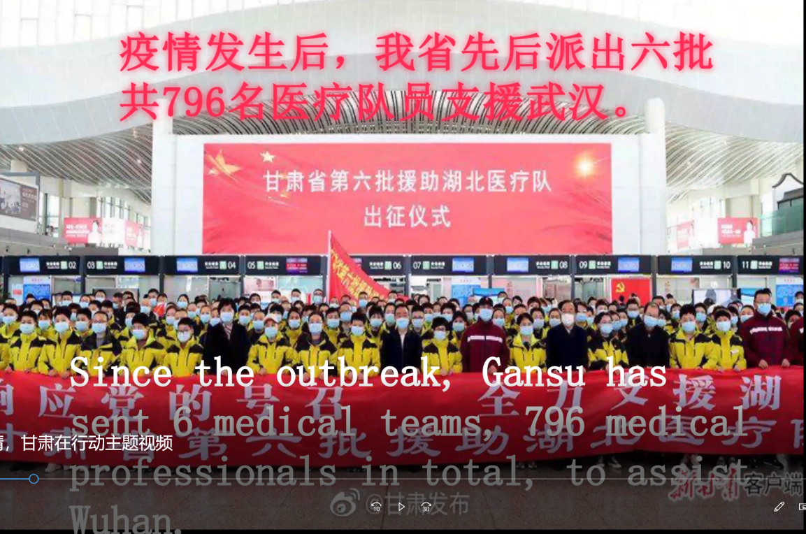 主题一:“发挥外语专业优势,讲好甘肃抗‘疫’故事”。用外语展现甘肃疫情防控典型事迹。同学们从冲锋在一线的医务人员、科研人员、广大党员干部尤其是基层干部,协助的志愿者等不同角度,借助一个个鲜活的故事,通过笔译或口译的方式,运用多语种讲述甘肃“抗疫”故事,为国内外人士展现了甘肃省在新冠肺炎防疫中的突出表现。