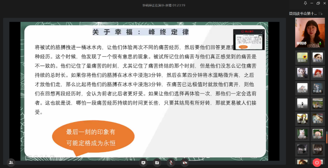 人间四月,桃李芬芳,如约而至的不仅草长莺飞的春天,还有书香致远的世界读书日。在第二十五个世界读书日来临之际,yl6809永利以“益周读书”系列读书会第十八讲特此献礼。本次读书会邀请了yl6809永利钟莉婷老师进行在线读译分享——《思维的发现:关于决策与判断的科学》。同时,学院院长曹进也跟同学们进行了在线分享。