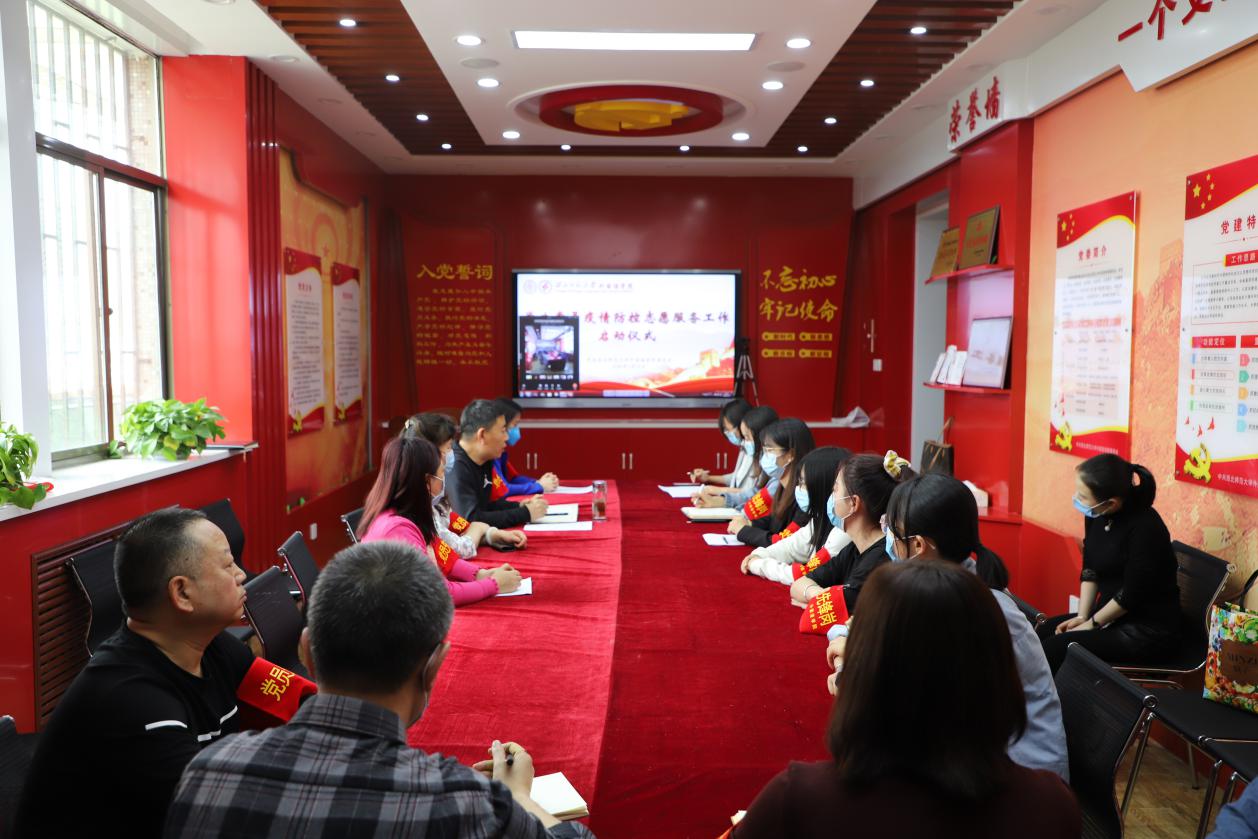 为切实保障我院学生返校后的健康安全,充分发挥广大共产党员的先锋模范作用,学院党委发出倡议、学生党员自愿报名,组建了学生党员抗疫先锋队,开展学院教学区和学生宿舍日常消毒消杀、疫情防控知识宣传、学生宿舍内务检查等志愿服务活动。2020年5月15日下午,学院党委在党员活动室以线上线下相结合的方式,举行了学生党员疫情防控志愿服务工作启动仪式,学院党委负责人、辅导员、教工第三党支部党员以及全体学生党员志愿者参加。