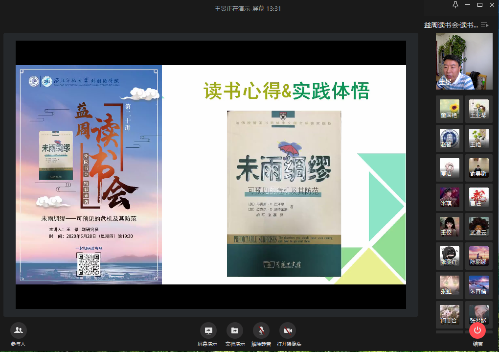 育人润物细无声,循循善诱讲安全。5月28日晚七点半,“益周读书”系列读书会第二十讲如期线上赴约。本期读书会邀请到yl6809永利党委书记王景,与我们分享《未雨绸缪:可预见的危机及其防范》。学院领导、教师、辅导员及各年级学生参与本次读书会。