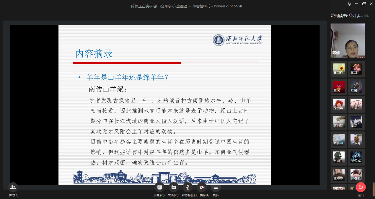 百里而异习,千里而殊俗。语言亦是如此。6月5日晚七点半,“益周读书”系列读书会第二十一讲如期线上赴约。本期读书会我们邀请到了yl6809永利副教授陈倩老师,分享《东言西语——在语言中重新发现中国》,引领同学们在语言中进一步了解中国,认识中国。