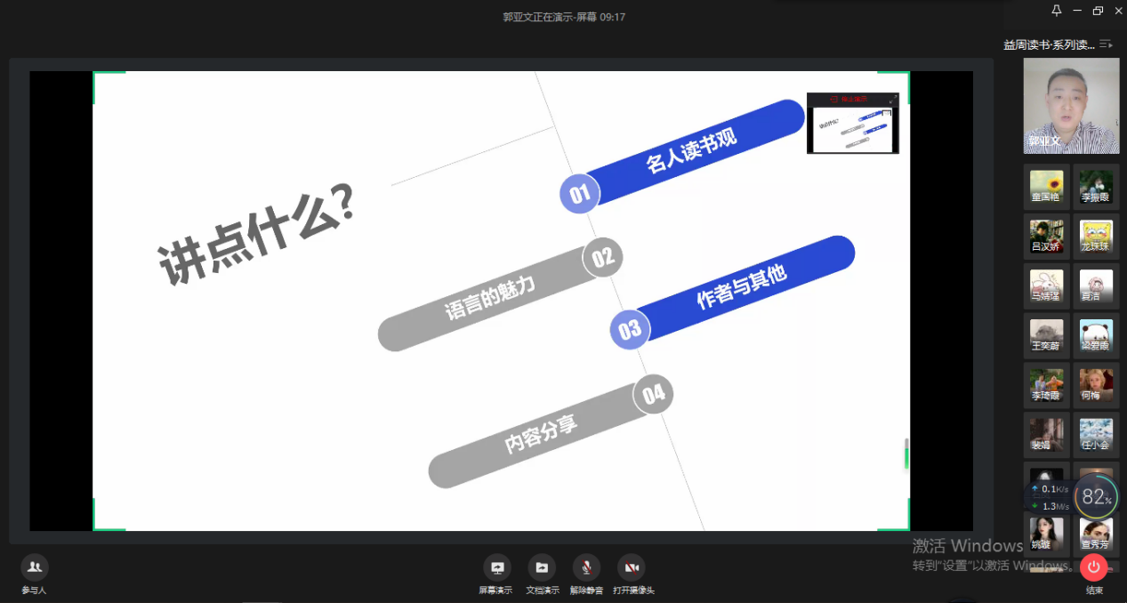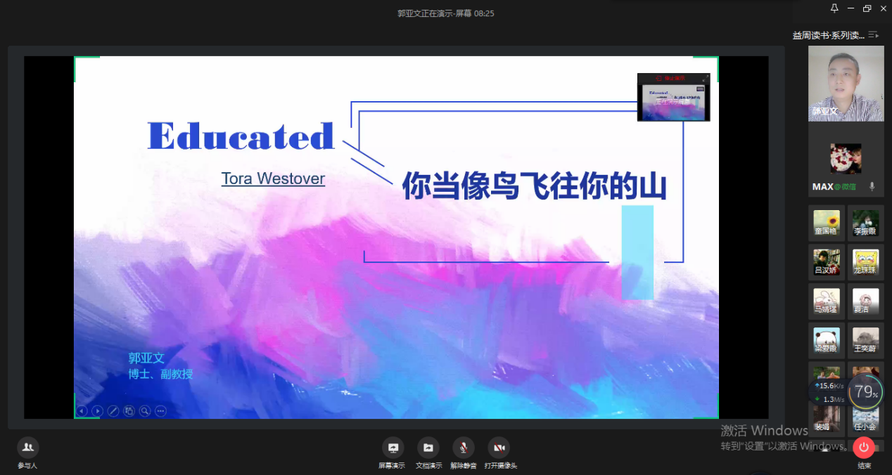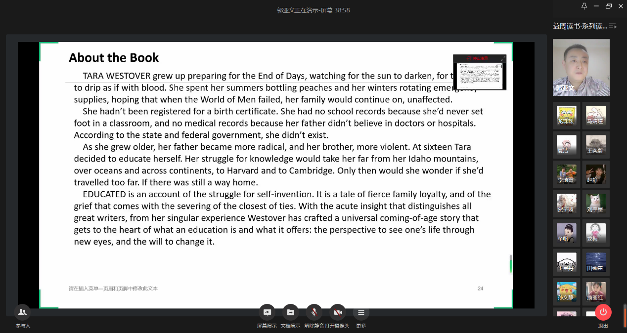 读书会之根本是清楚我们为什么读书?要怎样读书?郭老师从古今中外名人的读书观入手,借助林清玄《梁妹》、南宋词人周密《闻鹊喜》、余光中《听听那冷雨》等作品,在体会语言独特魅力的同时帮助同学们分辨学习过程中的感官偏向,明确读书方法与意义。郭老师对该书的序章进行了详细的解读,再现了作者Tara Westover的成长背景和教育经历,带领同学们身临其境,致力共鸣作者在书中所呈现的思想和信仰在矛盾中被摧毁、被动摇、又被重新塑造的过程。就此发散思维,郭老师也简单介绍了《杀死一只知更鸟》等一系列以鸟命名的书籍,提出了文本“细读法”、“含混”以及“陌生化”等方法,并借助一些耳熟能详的电影台词、歌词以及古诗词去加深同学们对这一系列陌生复杂概念的理解与应用。