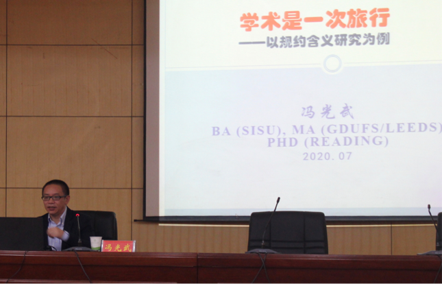 9月19日上午9点至12点,在逸夫图书馆报告厅,冯光武教授以“学术是一场旅行——理论语言学研究漫谈”为题,从“学术旅行”的角度生动阐述了何为理论语言学、语言研究者的工作以及如何进行语言研究。讲座后,冯教授耐心解答了我院同学的相关问题,以诙谐的语言和生动的举例赢得了台下热烈的掌声。