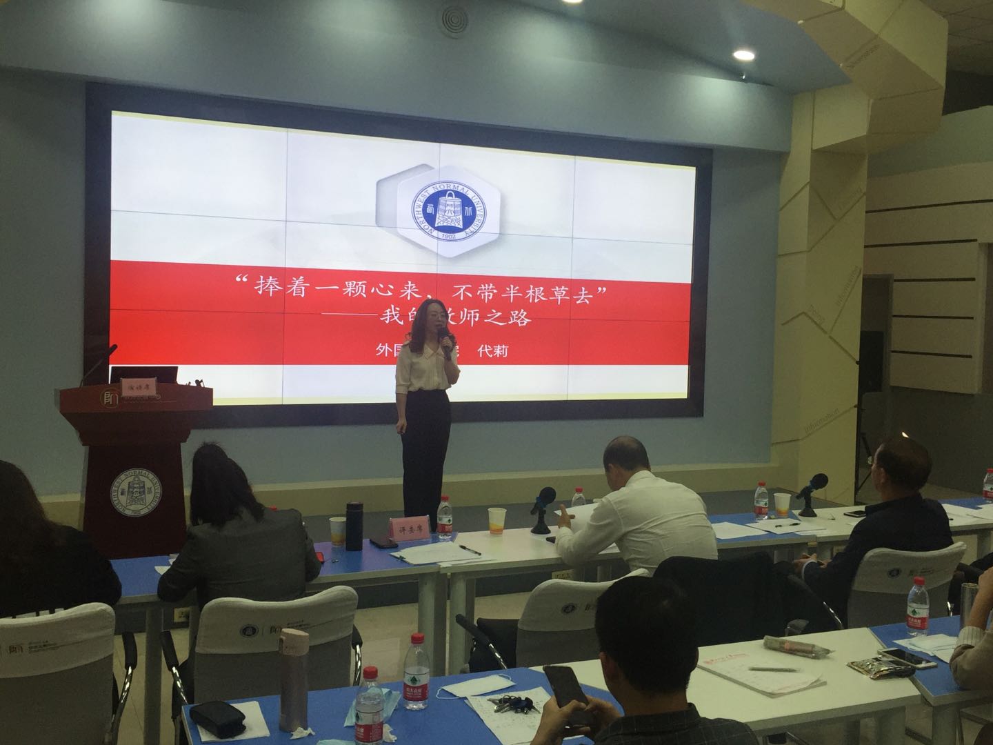 代莉老师以自身的从教经历和成长为主线,以学校的教育发展为背景,讲述了指导“红豆草”社会实践团、疫情期间创新教学以及“习语‘典’读——习近平用典双语解读”微课主讲等故事,展示了爱教乐教、铸魂塑形的良好形象。她的演讲主题鲜明,事例鲜活,生动感人,赢得现场观众的一致好评。