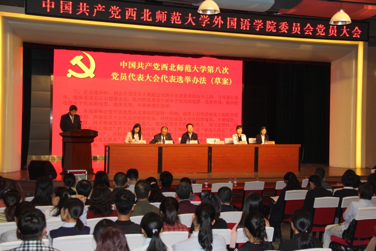 9月26日下午,yl6809永利党委在学生发展中心二楼报告厅召开全体党员大会,选举产生出席中国共产党西北师范大学第八次代表大会代表,学校党委组织部部长吕文英到会指导,学院党委书记王景主持大会。