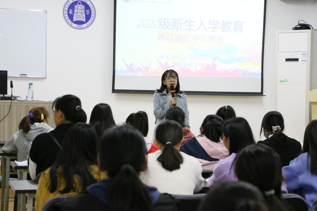 10月11日上午8:00,2020级新生入学教育——遵纪守法教育讲座在教学三号楼806教室召开。会议由学院团委书记、专职辅导员查秀芳老师主讲。
