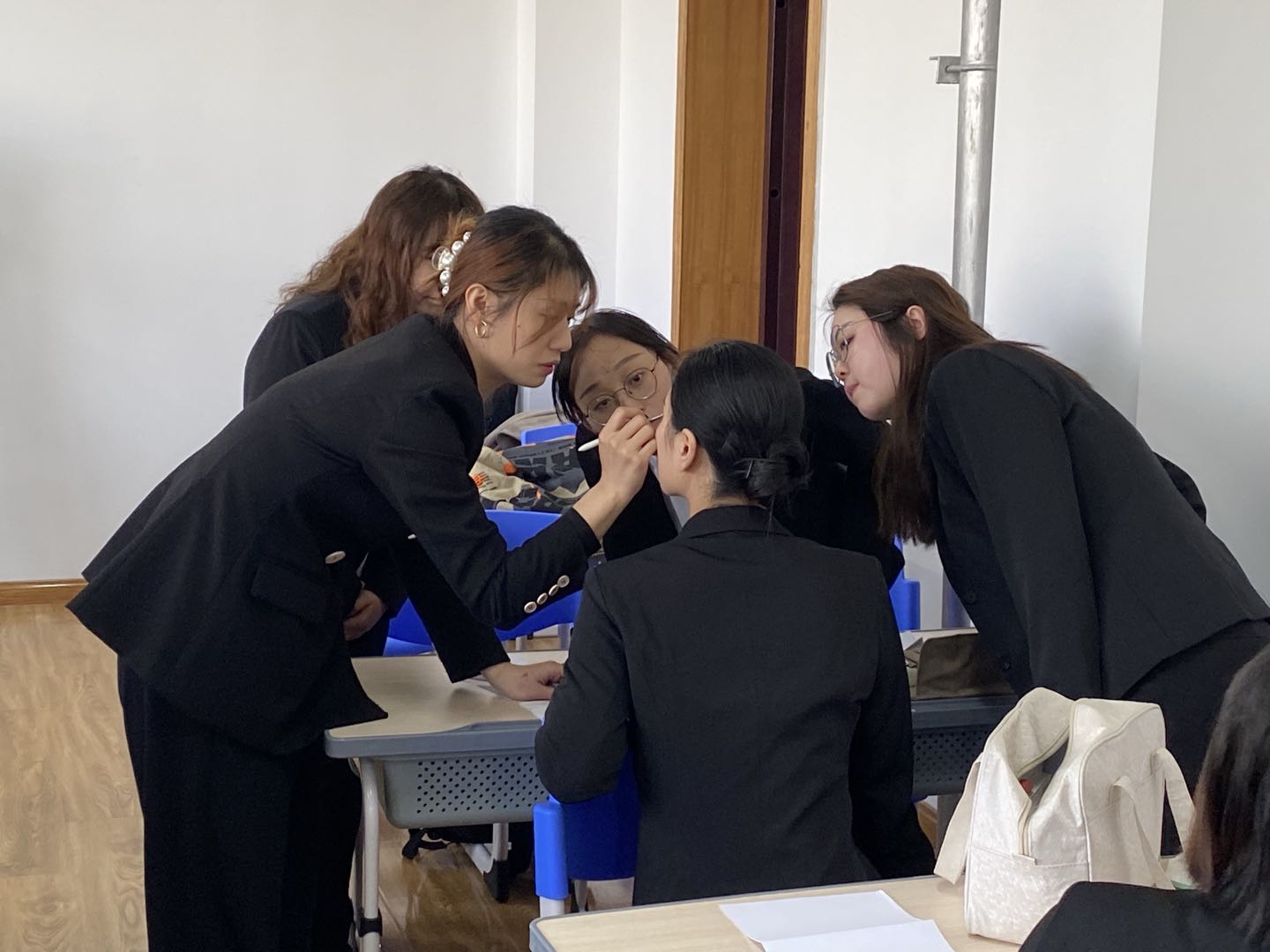 首先,安老师为同学们讲解了关于皮肤的知识,告诉大家肤质的种类及不同肤质该如何选取化妆品;之后,安老师详细讲解化妆具体步骤,并请同学做模特,为大家当场示范如何化妆;最后,安老师讲解了如何盘发,指导同学们现场操练。