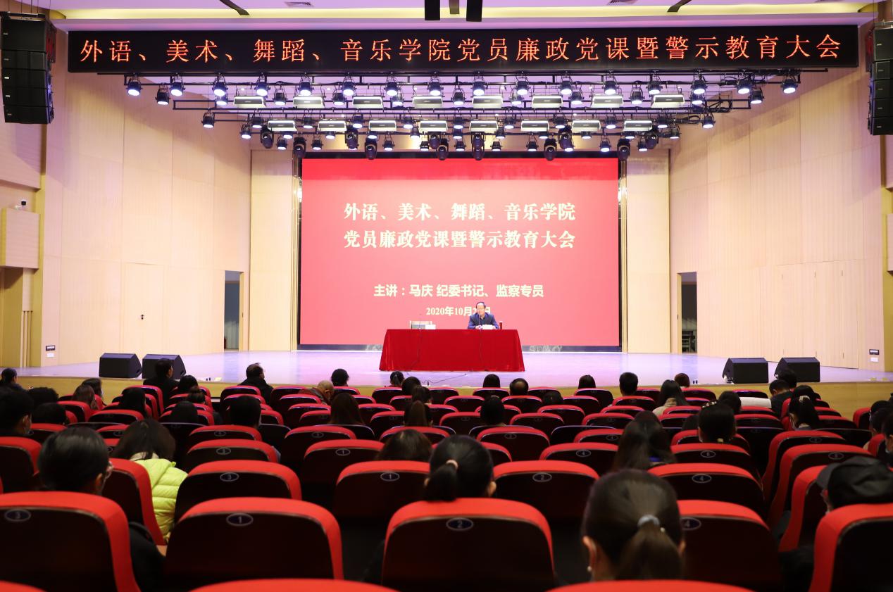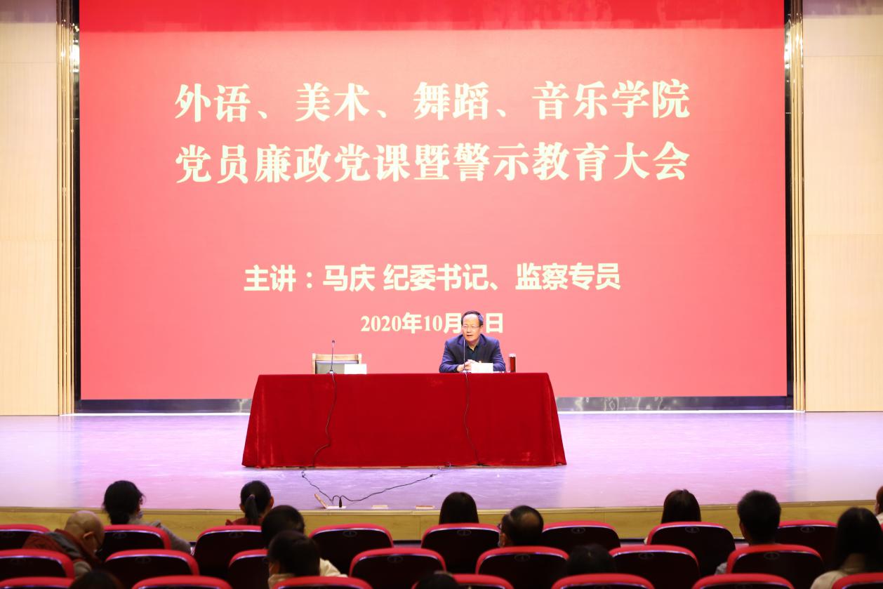 10月27日,yl6809永利、美术学院、舞蹈学院、音乐学院在音乐厅联合举行党风廉政教育宣传月教育活动,邀请纪委书记、监察专员马庆为全体教工讲授《强化理想信念 严守纪律底线》廉政党课报告,报告由yl6809永利党委负责人主持。